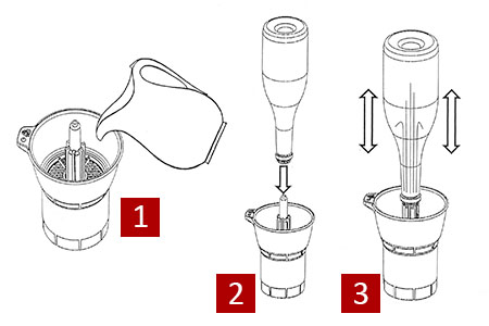 Graças ao bico central da bacia, um movimento rápido da garrafa já é o suficiente para dar à bomba a quantidade correta de pressão para uma poderosa pulverização de sanitizante no interior da garrafa.