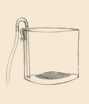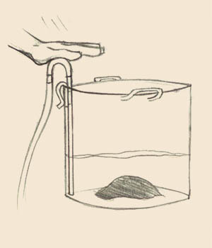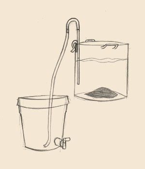 | 4. Com seu fermentador posicionado abaixo do nível da panela libere o polegar da mangueira abaixo do nível do líquido. A gravidade irá fazer a água do tubo puxar o mosto. Colete esta água e os primeiros 100 ml em um recipiente a parte e descarte. Despois deixe a mangueira encostada no fundo do fermentador.
